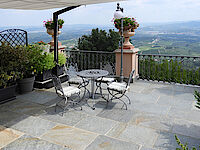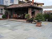 Pietra gneiss per pavimentazioni a spessore variabile da 2 a 4 cm, con superficie piano naturale e bordi martellinati che conferiscono al prodotto un aspetto anticato.