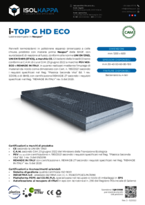 Realizzazione di isolamento termico con pannelli i-TOP G HD ECO termoisolanti in polistirene espanso sinterizzato, prodotti con materia prima Neopor® della BASF, conformi alla norme UNI EN 13163, UNI EN 13499 (ETICS), con marcatura CE, euroclasse E di reazione al fuoco secondo la EN 11925-2, conducibilità termica 0,030 W/mK secondo la EN 12667, resistenza alla compressione al 10 % di deformazione pari a ≥ 150 kpa secondo la EN 826, resistenza a flessione ≥ 250 kPa secondo la EN 12089. Gli isolanti dovranno essere conformi ai CAM come da D. 23 giugno 2022 ed avere il marchio PSV mix eco o REMADE IN ITALY.